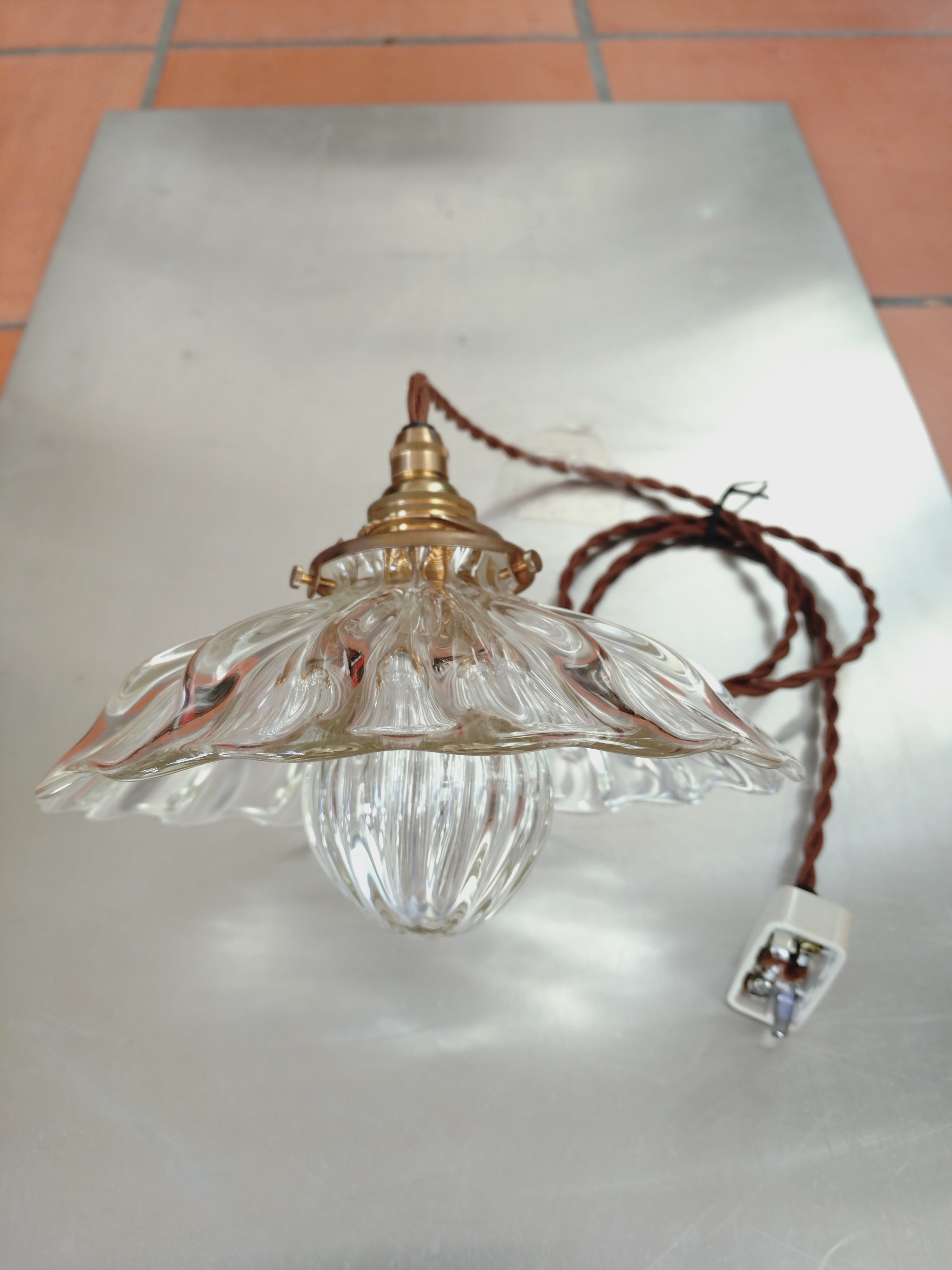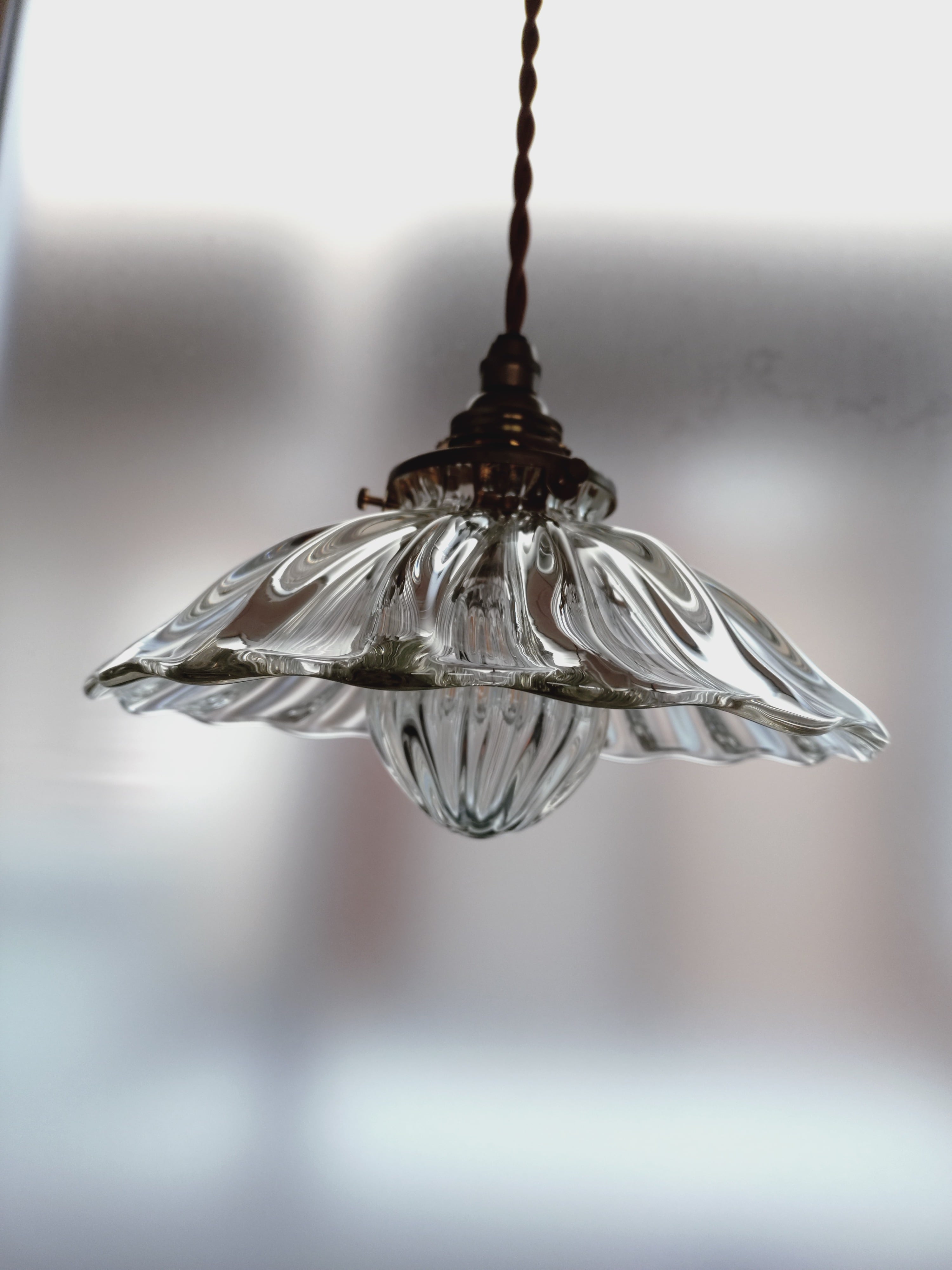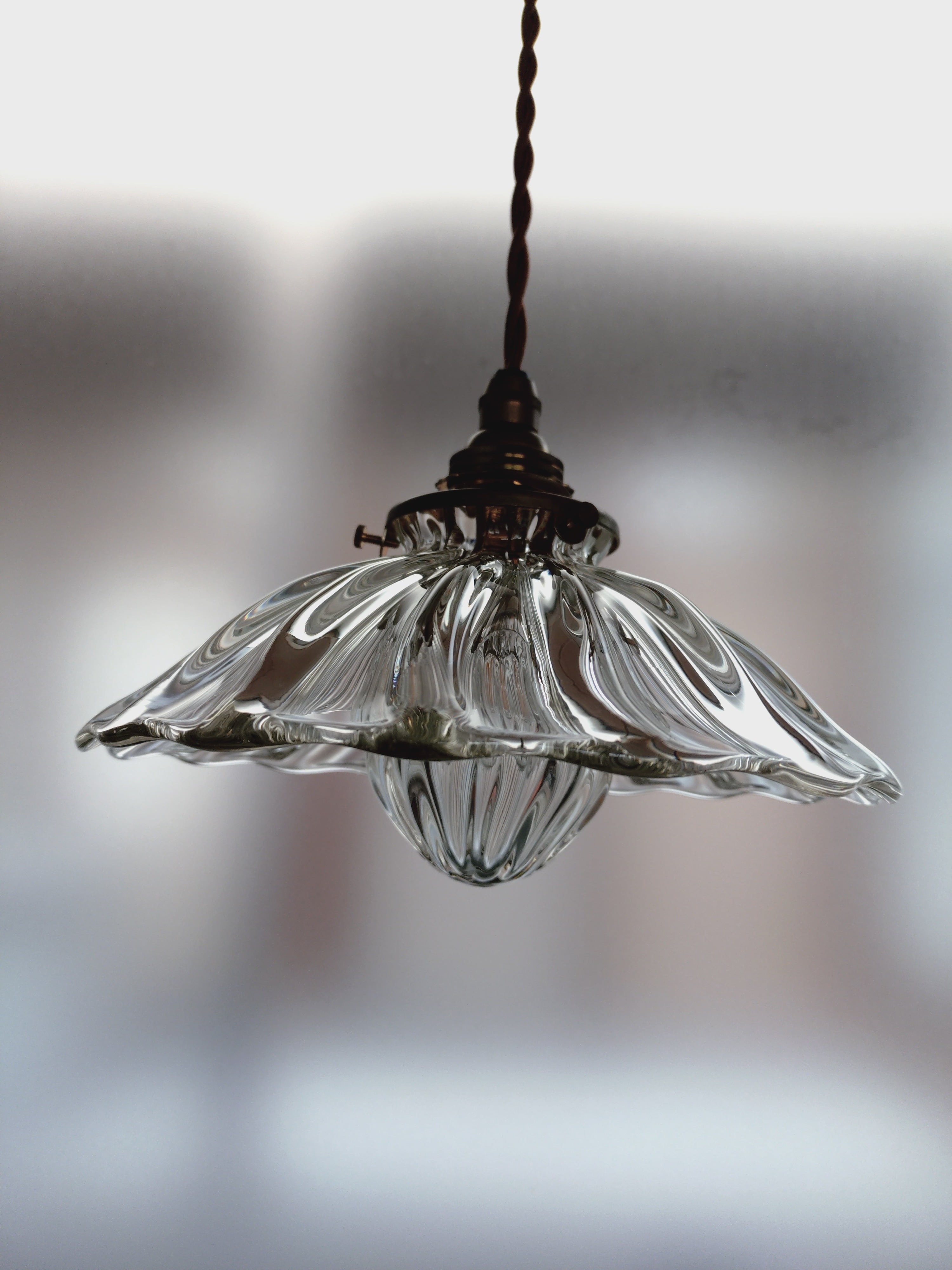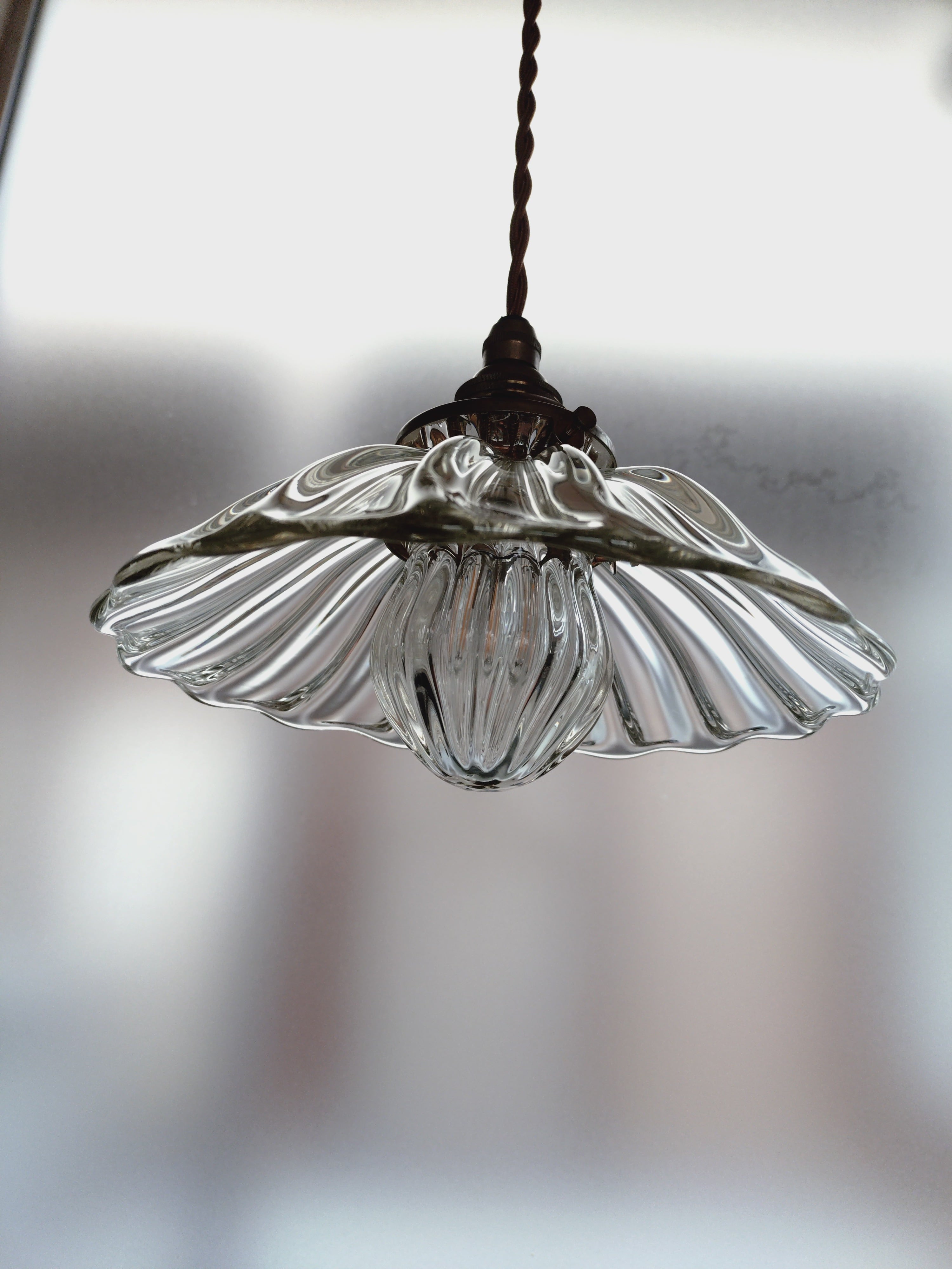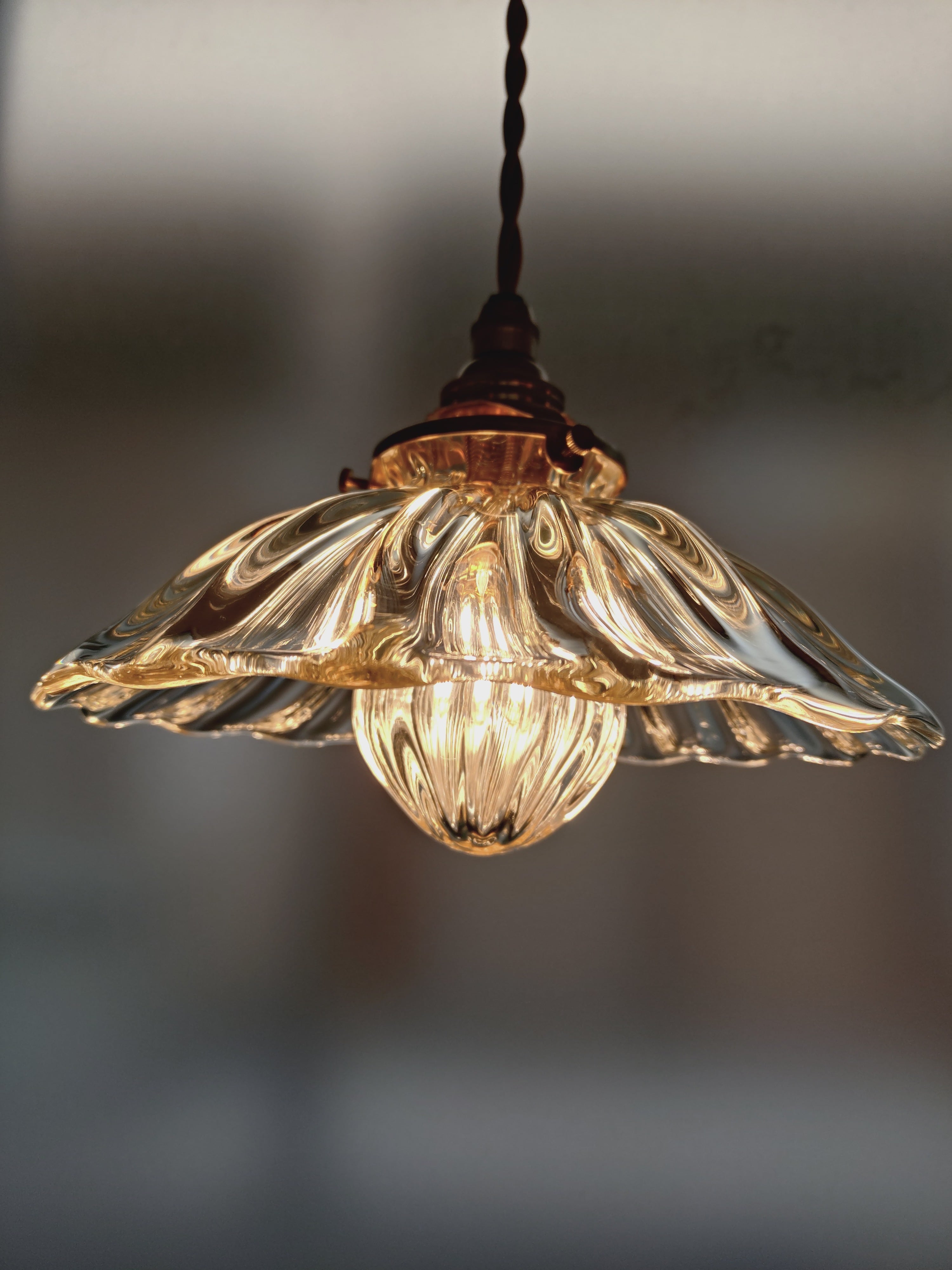 光の屈折が美しいアンティークなイメージのランプ。昔ながらの笠の形のランプですが、下の玉の部分も吹ガラスで制作し、電球を覆っています。上の笠に似合う玉を制作したいと思いました。これにより、ランプ全体が波模様の光の屈折により、光が幾重にも散らばってノスタルジックなイメージを演出しています。
