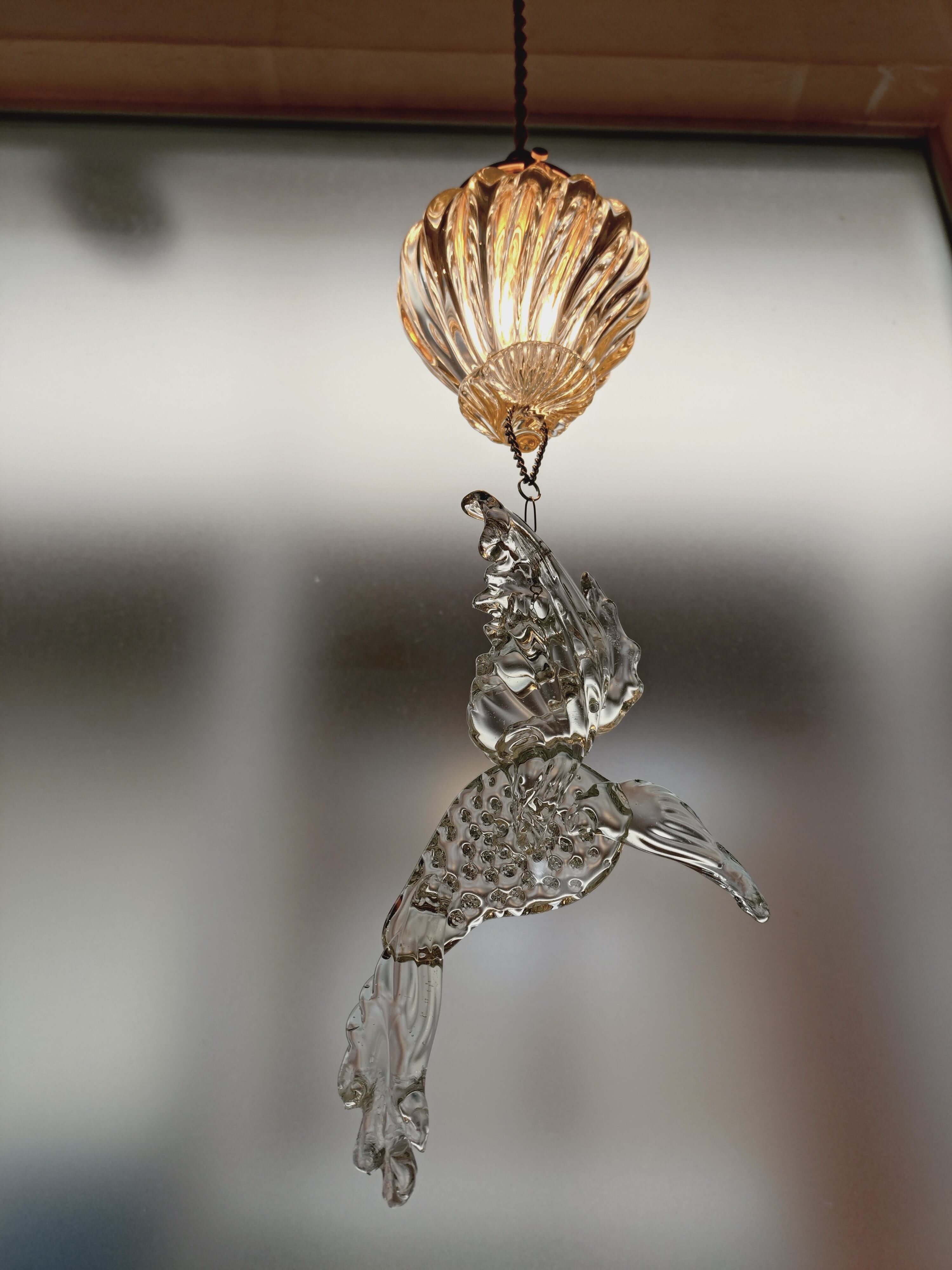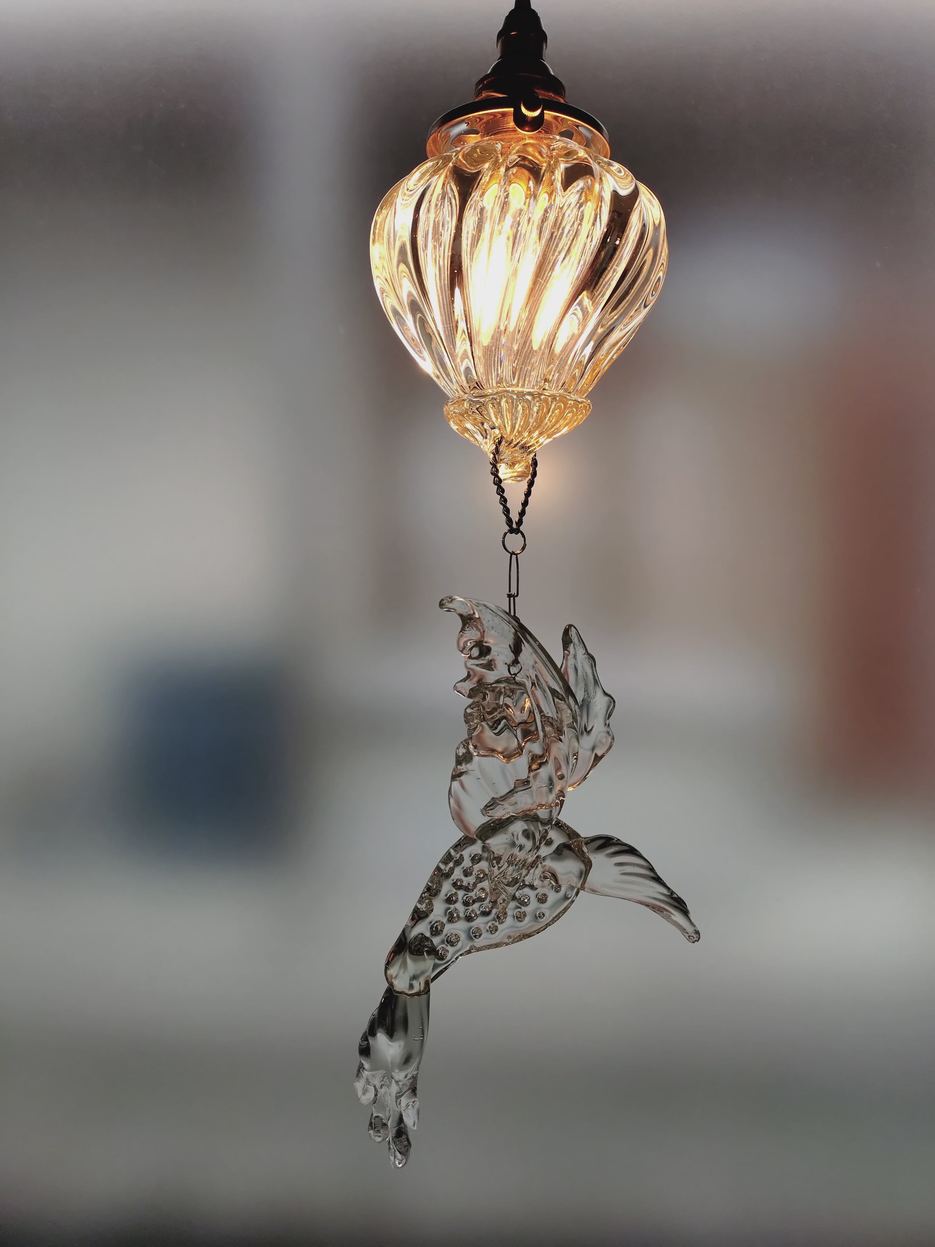 ランプ、鳥共に透明を少しアメ色がけているので、LEDの光でも暖かな光に見えます。