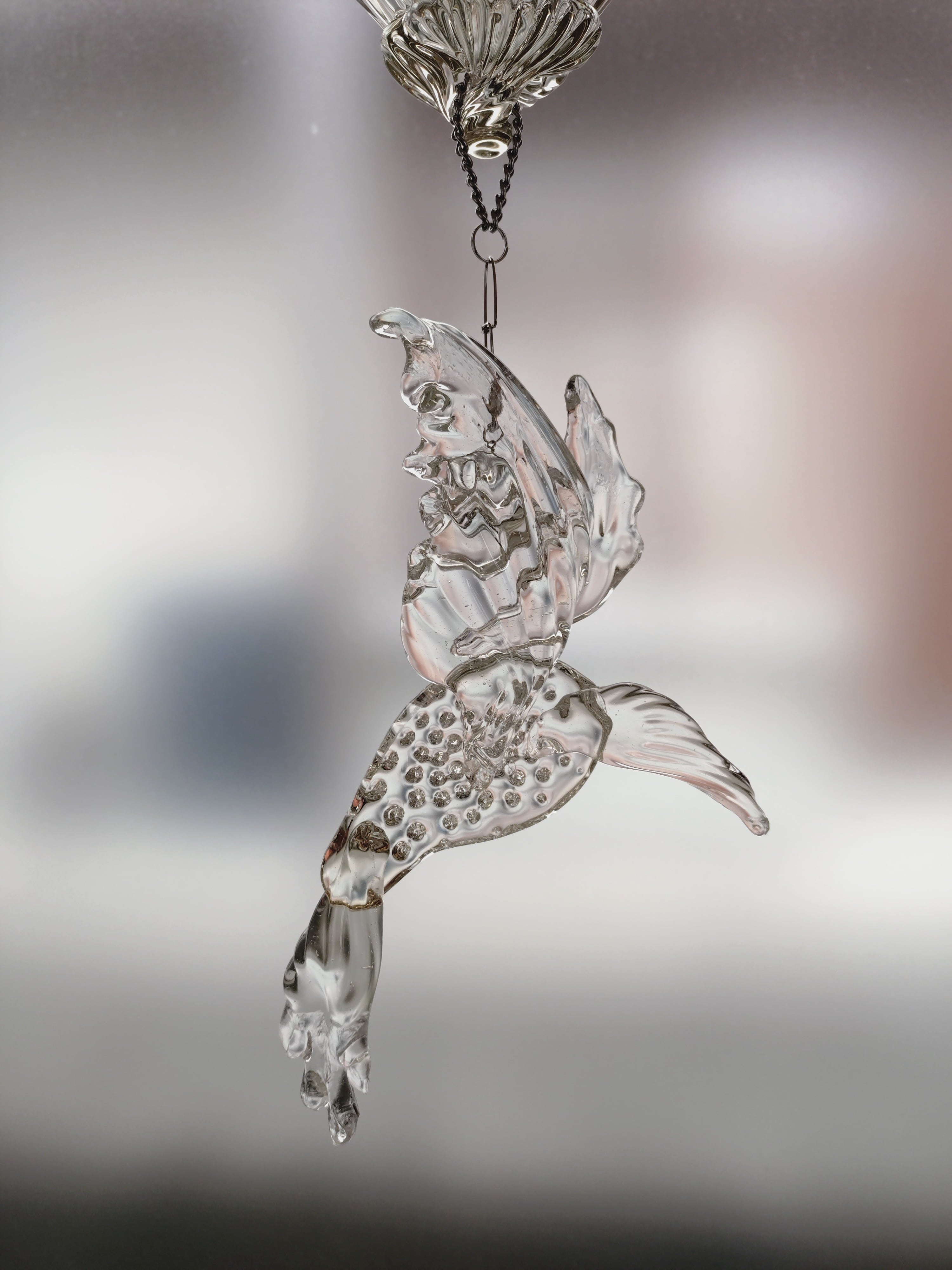 ランプの下に鳥が揺らいでいると、夢のあるような雰囲気が演出できるのではと思い、制作しました。昼間点灯しなくても、その雰囲気を楽しんで頂けたらと思います。鳥の部分は手で回転させることができます。