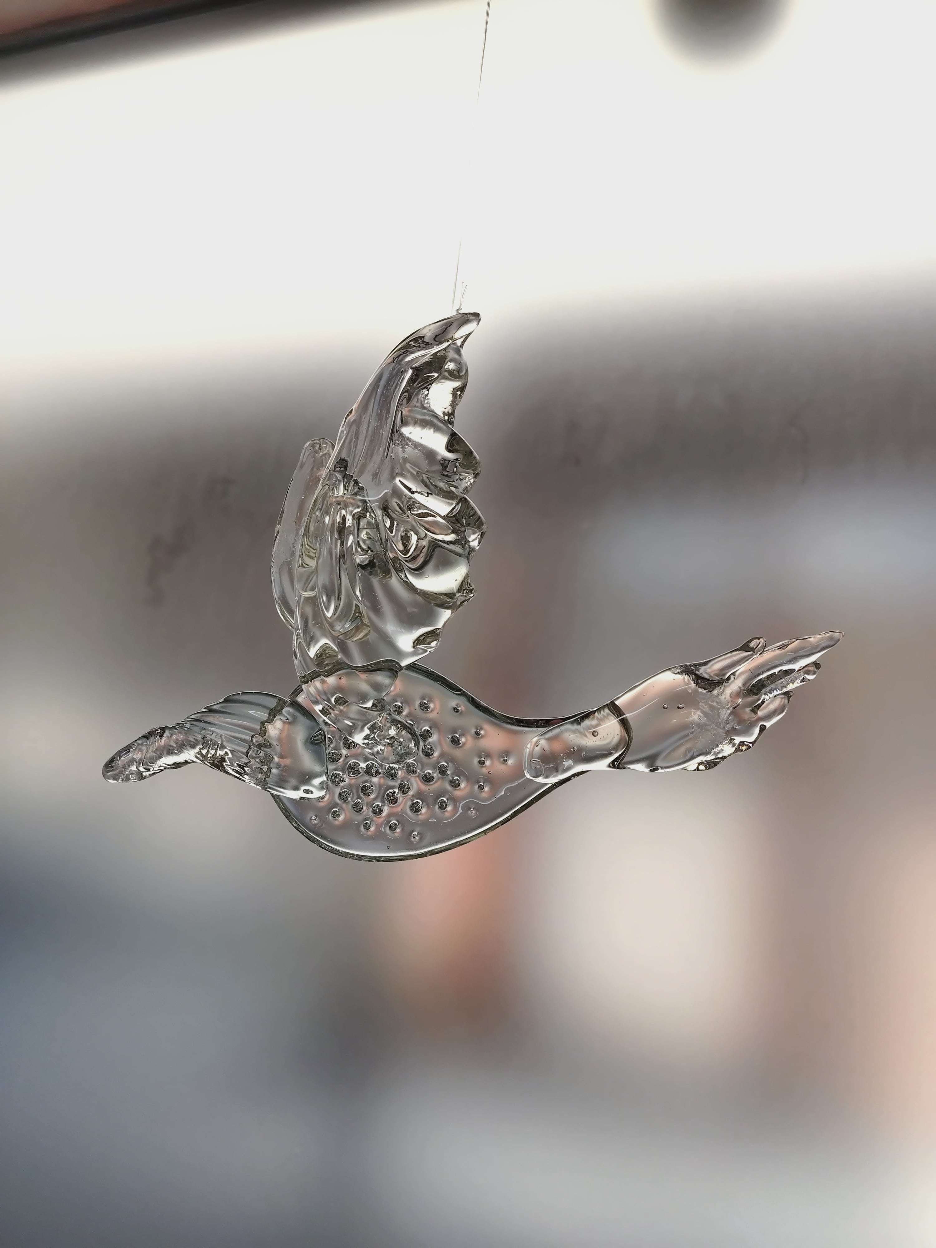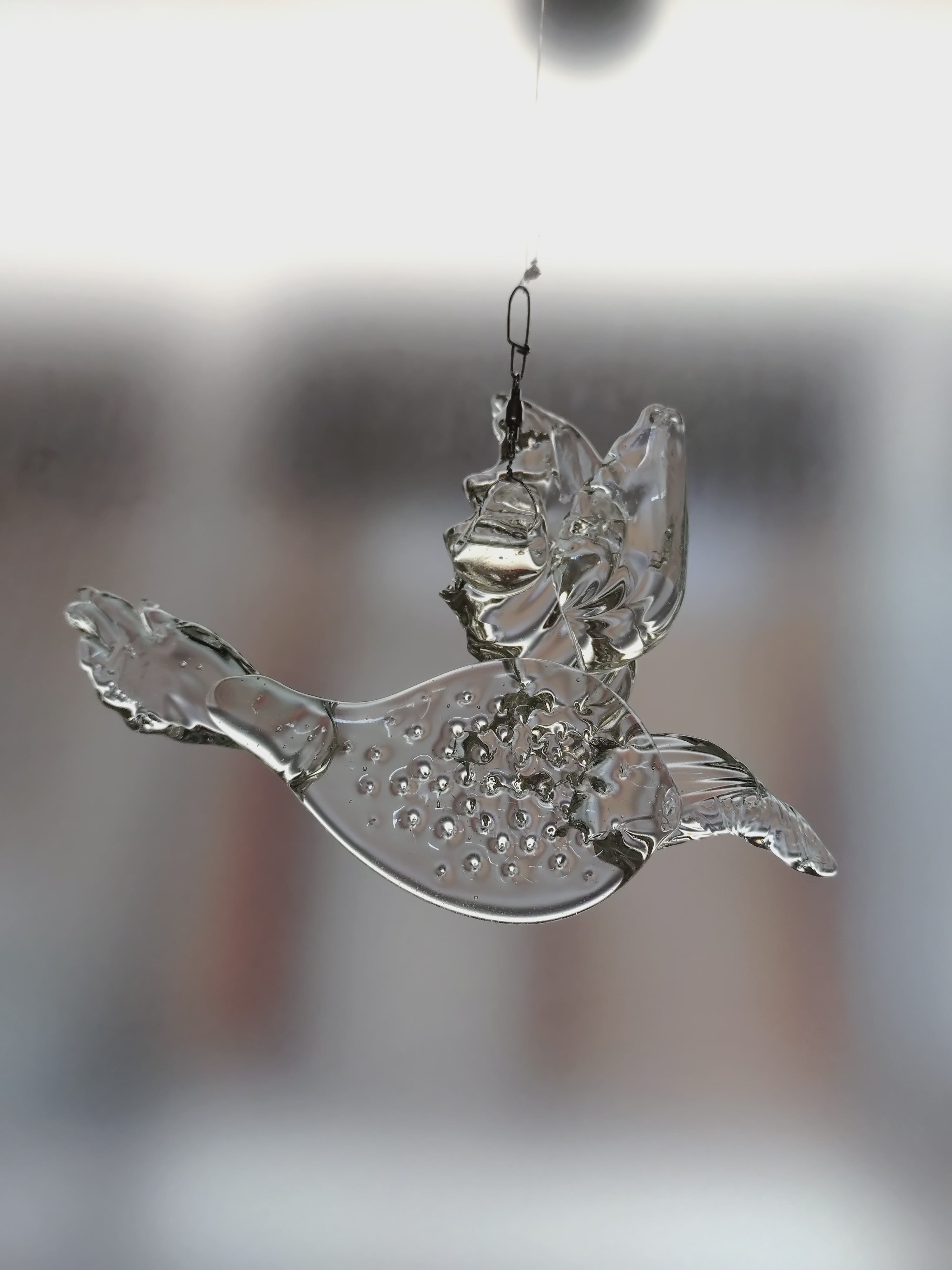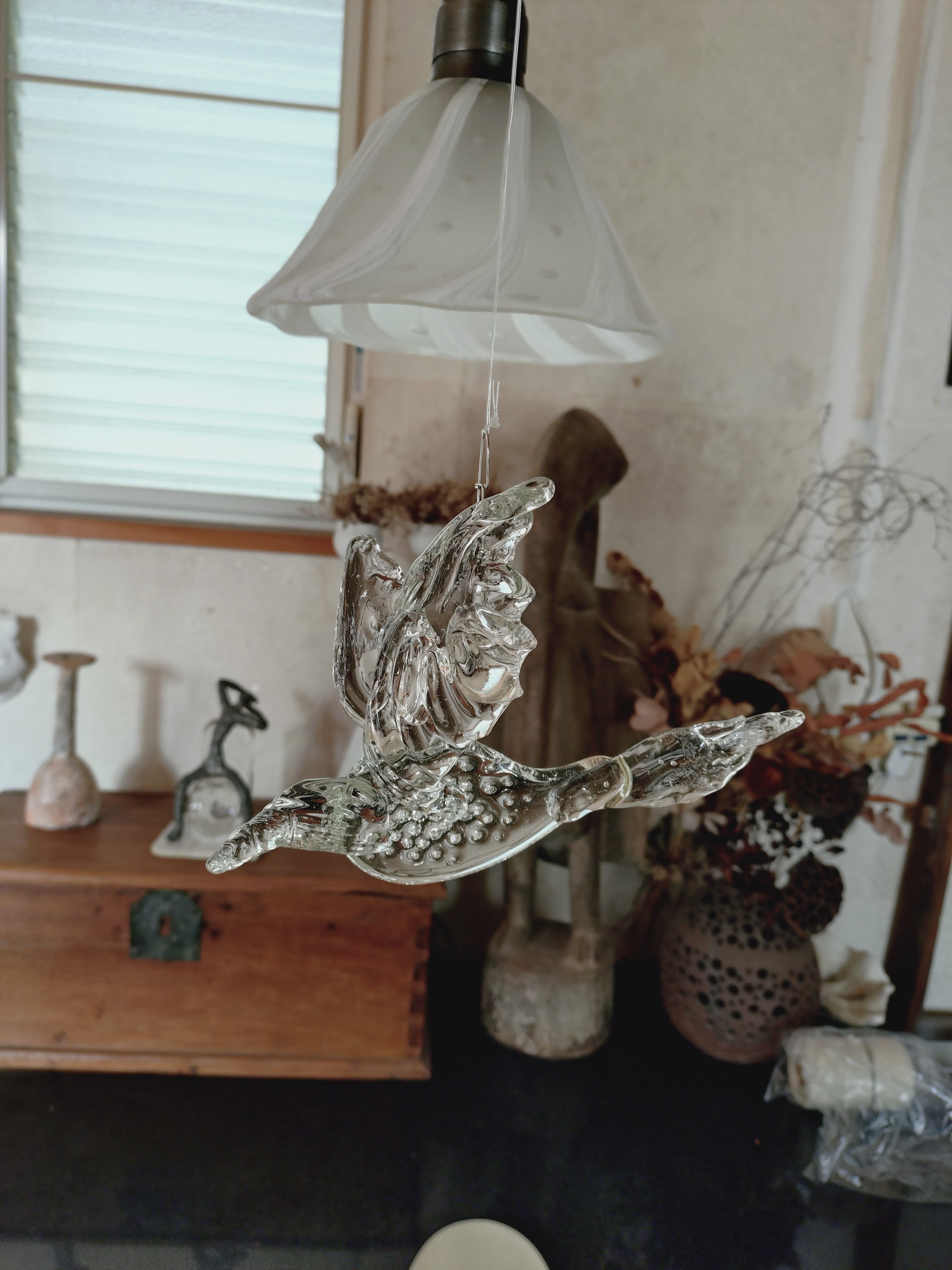 ガラスの光を表現したいと思い、空に浮かぶもののイメージのサンキャッチャーを制作しました。窓辺、又は室内に吊るして光を楽しんで頂けたらと思います。